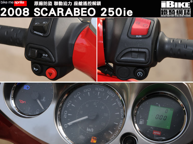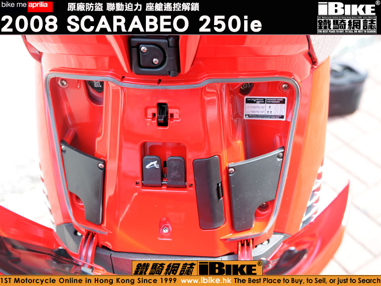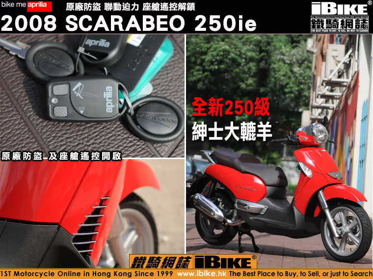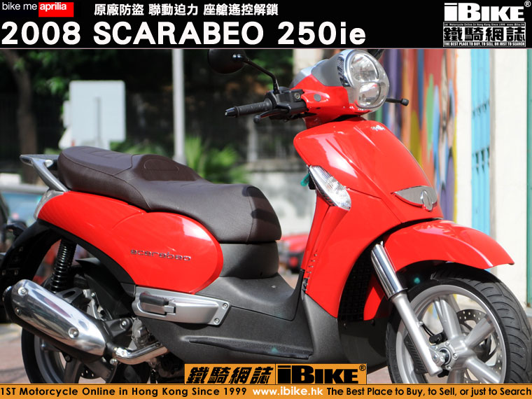 2008 Scarabeo系列有250/400/500三款引擎選擇,率先抵港的全新Scarabeo是最受香港人歡迎的250級別。根據廠方的說法,Scarabeo的開發和製作,環繞著五個中心思想,分別是:易用、好玩、自動、寬敞和舒適。集齊以上五個優點,再加上頭16尾14大直徑輪圈,便是全新aprilia Scarabeo:為用車之人士提供一份具行政味道的實用套餐。