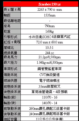 有關新車的引擎規格馬力等數據請參看以下的規格表。21ps馬力水冷四衝244cc單缸四活瓣引擎,還有電子燃油噴注系統,慳油好力,也符合歐盟三期的廢氣標準。如果是400/500的Scarabeo,引擎內更設有動態減震平衡軸,減低震盪感。油缸儲量達到13.2公升,提高續航距,令Scarabeo變得更實用。