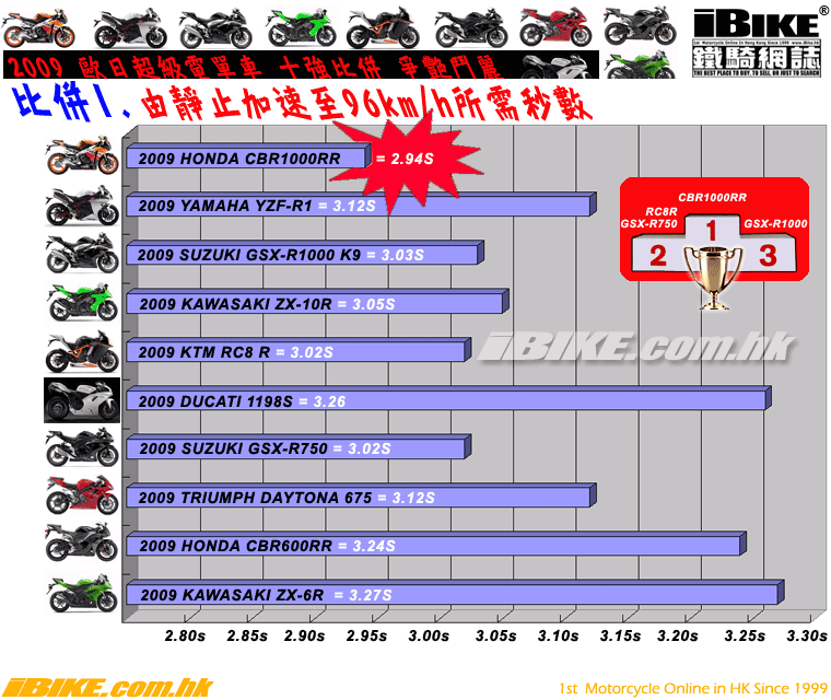 2009年差不多已過了一半,執筆時除了BMW S 1000 RR尚未有道路試騎報告之外,其餘各大主流超級電單車都紛紛現真身甚至交了車。也是時候比較一下各款跑車的輸出和加速性能。