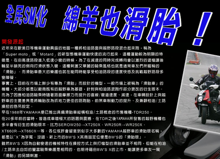 09年三月Yamaha終於把BW's分拆出行走舖裝路面的X版,在銷售策略上,與WR250車系有異曲同工之妙。