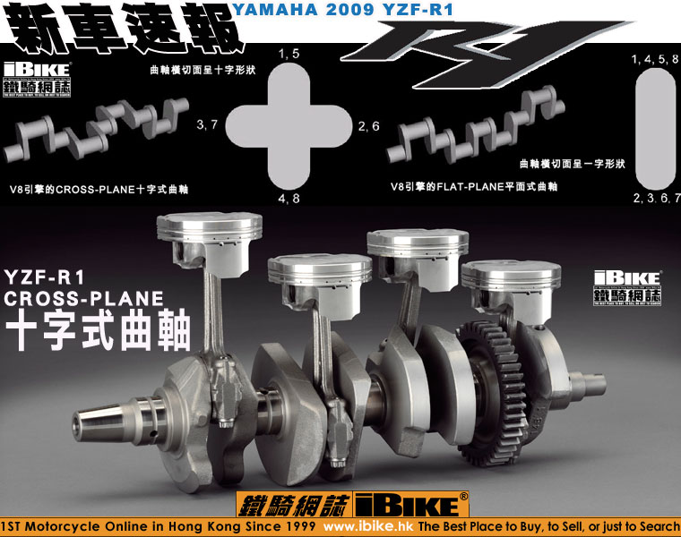 相比起現款R1,09年R1的曲柄直徑由32mm增至36mm,以應付十字式曲軸的需要。全新YZF-R1的引擎壓縮比是12.7:1,缸徑衝程分別是78.0