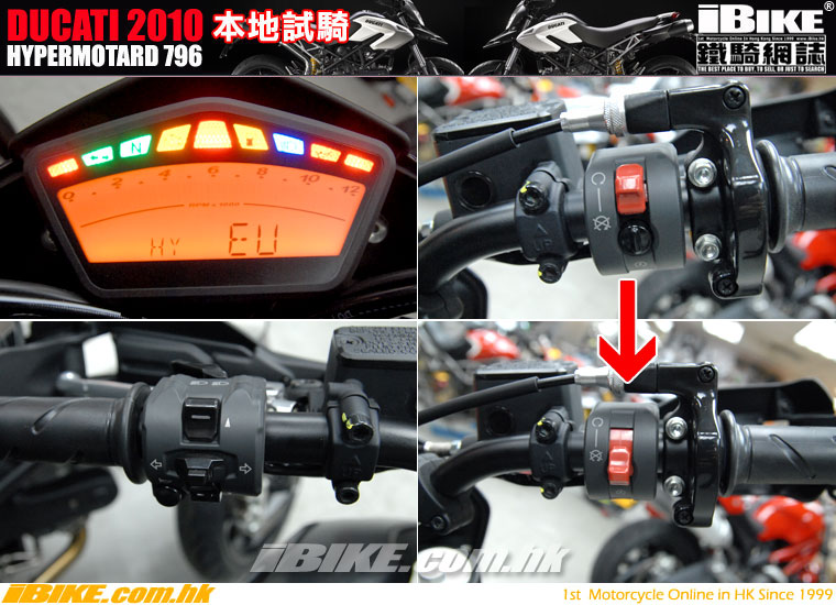 | Hypermotard 796除了保留HM1100的進取外型之外,連設備也有改良。死火掣和撻車掣的設定,取自Ducati高性能街車旗艦Streetfighter的設計。啪下死火掣便會連帶把撻車掣也收藏起來,相當得意。 | |||||||||||||||||||||||||||||||||||||||||||||||||||||||||||||||||||||