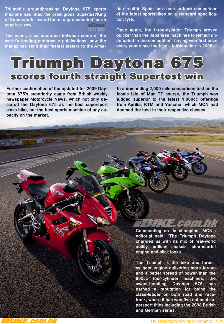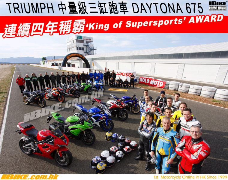 由多份世界知名的電單車媒體聯合舉辦的超級比併測試,在Supersports級別中選出Triumph