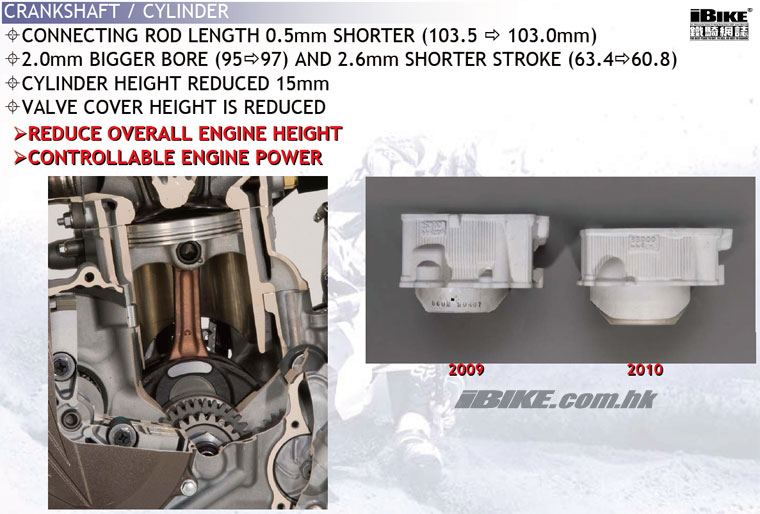 2010 YZ450F的後傾式汽缸設計,好處是可以減少油氣燃燒時把活塞壓下的阻力。傳統引擎設計,活塞連桿在活塞上止點時是傾斜姿態。當活塞向下壓時,傾斜的活塞連桿便會把活塞推向汽缸壁,增加阻力。YZ450F的活塞連桿在活塞上止點時是垂直姿態,當活塞向下壓時,活塞連桿是以垂直姿態推動曲軸。阻力減少令動力更暢順,也可以增加油門和尾輪的連接性。