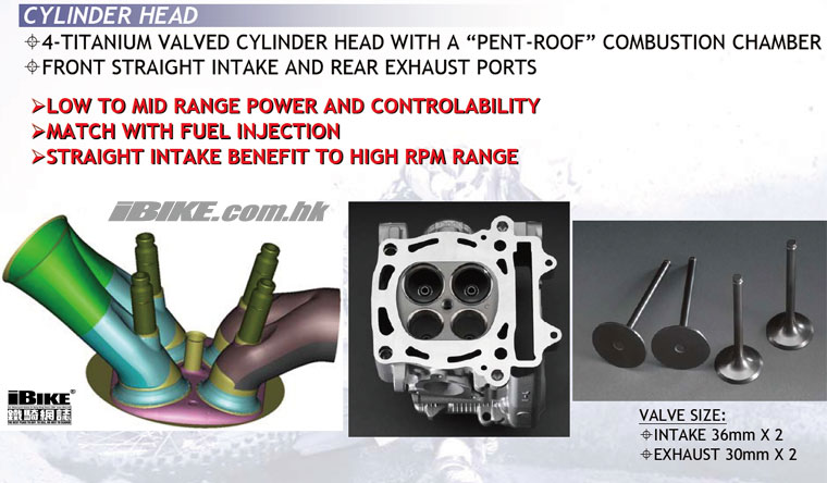新車的風盒改在車頭位置,更輕巧,防塵性更好,同時方便營造更直接的進氣岐管,也改善前後重心分佈。繞了一圈的死氣喉,有效長度約為1000mm,增加低中轉時的導氣性能,新喉在設計時也考慮到重心分佈的問題,排氣岐管更接近機器中央。