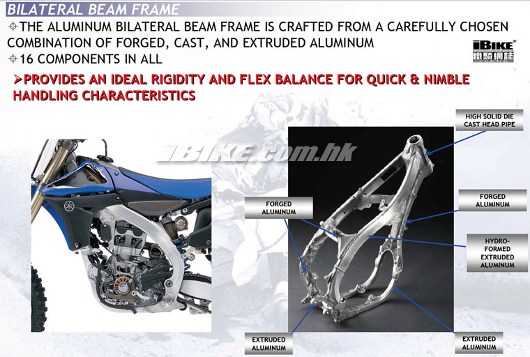 鋁金金雙樑式車架,車架呈流線S型,並分別由鍛造、鑄造和高壓鋁材製作。全個車架總共有16個組件,在不同部份提供最適當的剛性和重量。