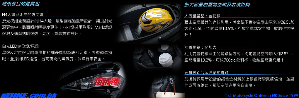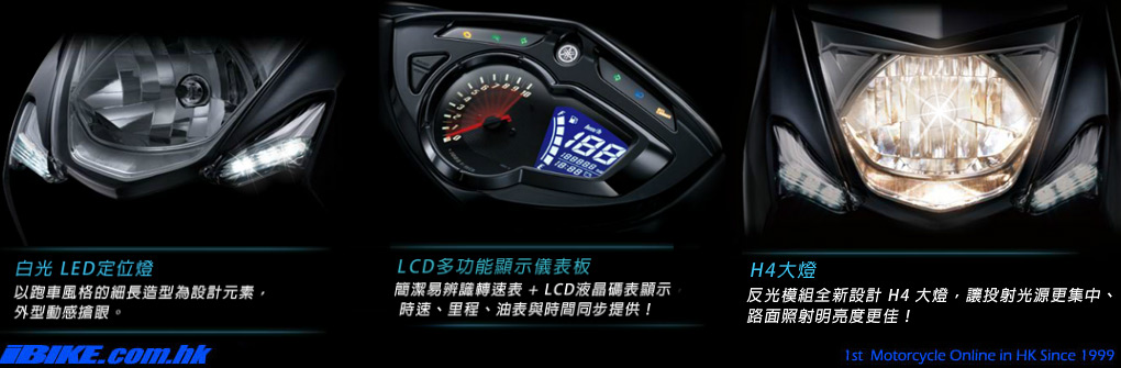 白光LED定位燈及尾燈打造全新CYGNUS X的霸氣和科技感。跑車風格的環繞式LCD俵板,更新增電壓顯示機能,讓車主隨時掌控車況。 |