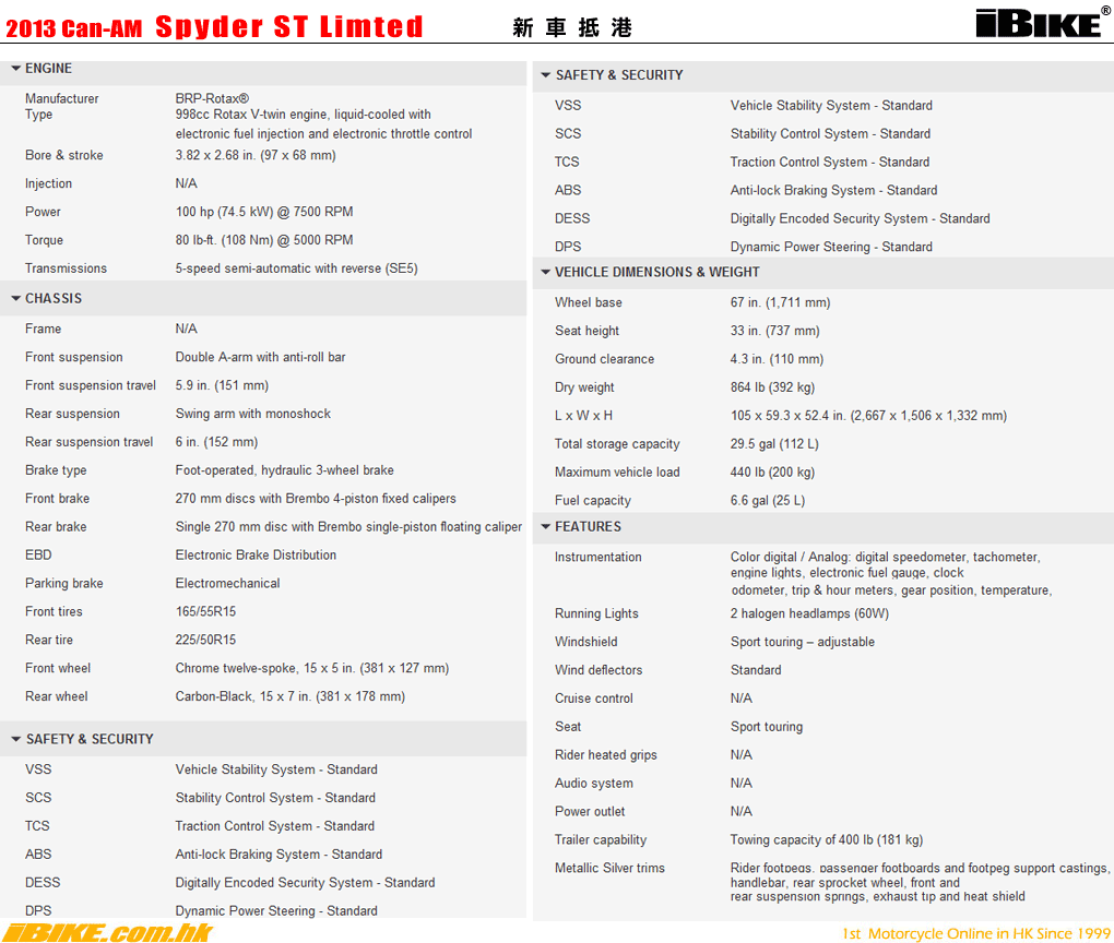 結合循跡系統和防鎖死煞車系統的車身穩定系統當然也配備在全線ST系列之上。引擎仍是Rotax的V2
