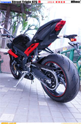 | 2012年以前的Street Triple 675R,排氣系統是高置座下雙出尾喉設計。自2013年起,Triumph推出了新款Street Triple 675R。在外觀上最大分別是排氣喉改用傳統的單邊下置死氣喉。車身也輕了6kg,並首次可以選配ABS系統。