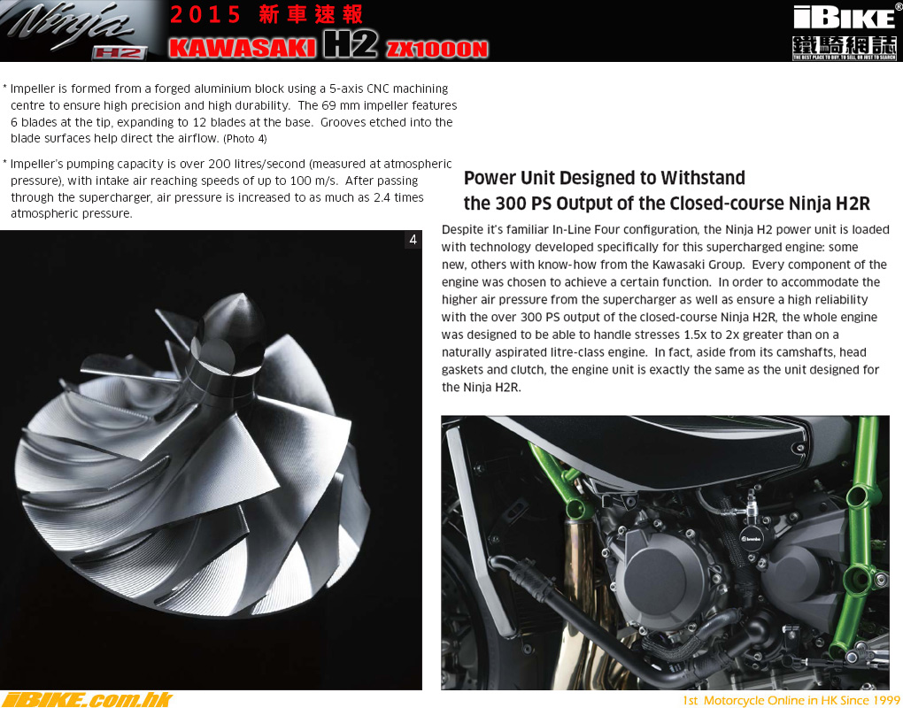 Kawasaki綜合川崎集團的航空及其他相關機械技術,把機械增壓技術重新移植在電單車身上,全程不假外求,百份百日本川崎技術。998cc直四機器配置機械增壓之後,馬力輕易突破300ps。考慮到各國安全法例和實際街道情況,這個project一分為二,賽道版H2R可以盡情發揮這臺引擎的潛力。而街道版H2則著重現實和法規的實際情況。
