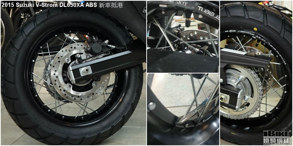 V-Strom頭輪直徑達到19吋,根據以往試騎經驗,新車轉向時頭擔表現穩重,頭輪咬地,操控平衡度高,壓車時感覺相當安全。2015年的XA版改用無內胎的鋼線輪圈,重量更輕,彈性更高,處理不同地形的能力更強。留意新車的頭尾輪圈的構造有別。頭輪是雙骨,尾輪是單骨結構。