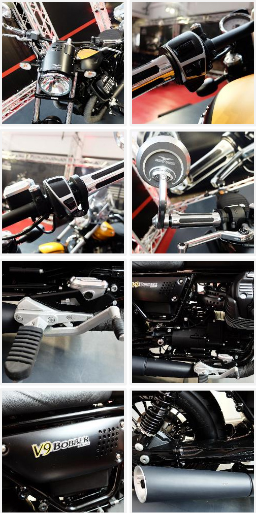 如果閣下一直喜歡Moto Guzzi V7的外型,但又希望可以有更高輸出的話,全新設計的V9便對正你的症,下正了藥。廢氣質素符合歐盟四期標準的V9,引擎排氣量增加了,動力提升了。引擎、波箱、尾擔、車身線條及細節,包括油缸、盤頂、掣盒和錶板都是全新設計。兩車的缸徑x衝程的數據完全不同,V9並不是只把V7引擎bore大咁簡單。V9更分為兩個型號:走簡約懷舊路線的V9 Roamer,和今次主力介紹,用肥仔胎、低座位、一字闊把手,外型更具侵略性的V9 Bobber。