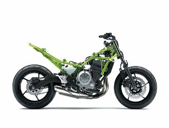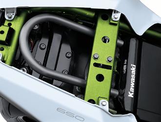 新車的重頭戲是車架:這份由高拉力鋼所組成的編織式車架是全新設計,和H2R的車架一樣塗上金屬綠。尾擔也是新作品。只有15kg重的全新車架,和只重4.8kg的新尾擔,是減磅行動的其中一個重要功臣,也提升了剛性,對操控有一定的補助。 |