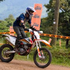 思思試騎KTM EXC 250cc的越野電單車,騎上部車雙腳掂不到地面,車身比較高,座高960mm, 坐姿向前傾側向左邊單腳掂地,起步後由於車身輕的關係,只有101.9kg,非常易操控,油門反應控制得心應手,在沙石路上轉向非常靈活,適合新手入門駕駛。