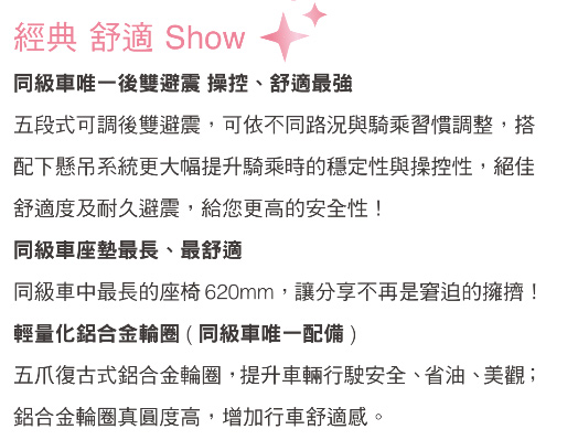 | J-BuBu充滿歐洲復古風味的J-Bubu,外型圓潤可愛。輕巧車身再加上平地臺設定,極適合女騎或新手使用。有人會問,為何特別版不是125.cc呢?原因是J-BuBu台灣本土版是115cc,出口版才是125cc。特別版因為詳量不多,只供應台灣本土市場已經相當緊張,所以未能照顧出口版。 |
