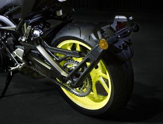 車尾的泥擋直接地與尾搖臂連接,是Yamaha首臺採用這個設計的車款,好處是從側邊望去時,感覺更輕盈。死氣喉的造型也有修改,令線條更緊湊更配合其他改動。 |