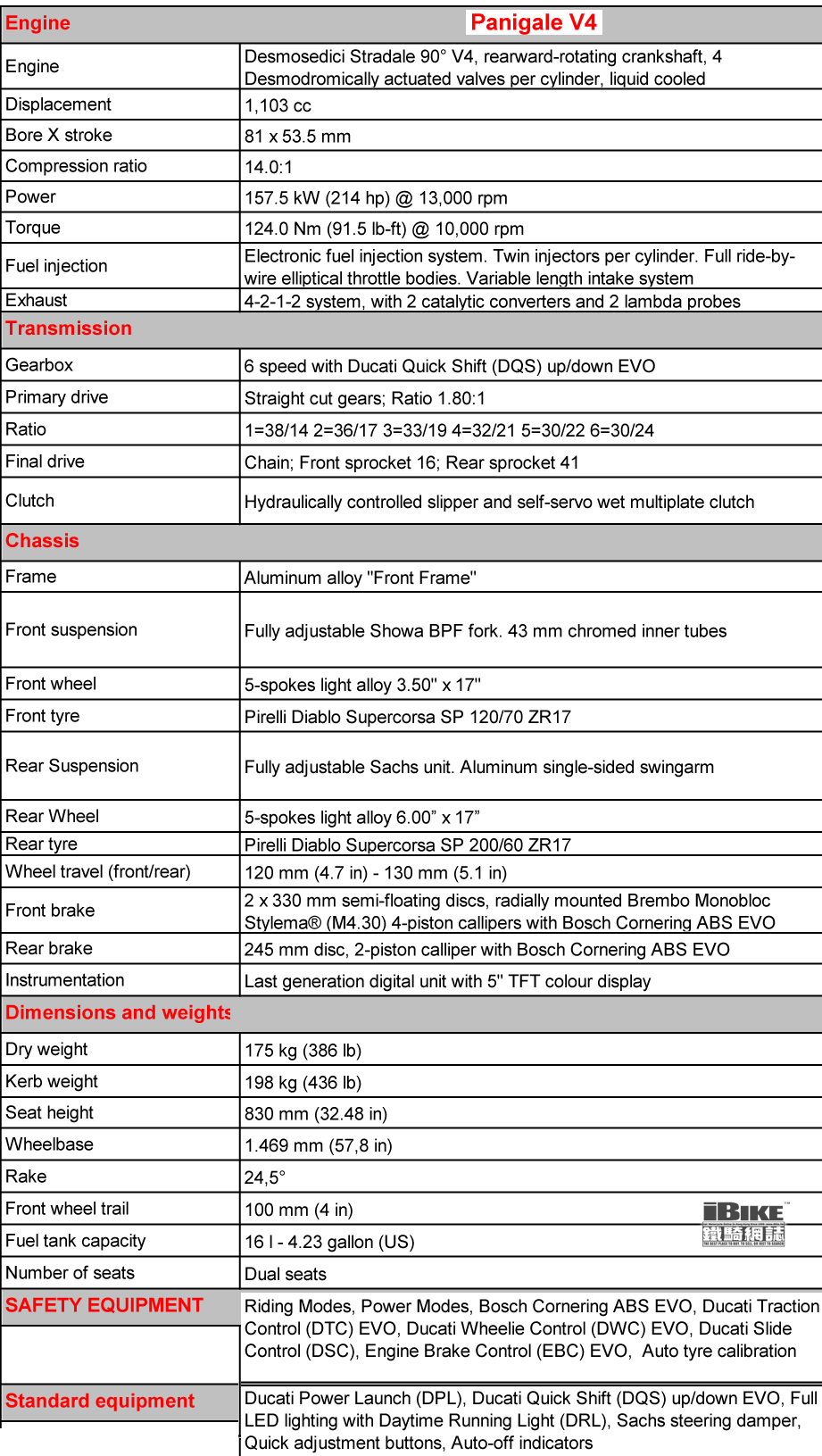 2.0電子釘把和Ohlins NIX 30前叉和TTX36尾避震、鋁合金鍛造輪圈和鋰離子電池。 而V4 Speciale則是限量版,單座、紅白車花。配備更多落場專用的賽車部品,例如賽車式風擋、Alcantara皮座墊、賽車式油缸蓋、Carbon部品等。當換上Speciale版專用的Akrapovic全梳鈦合金賽車喉之後,馬力可以由214hp再升至226hp。 |