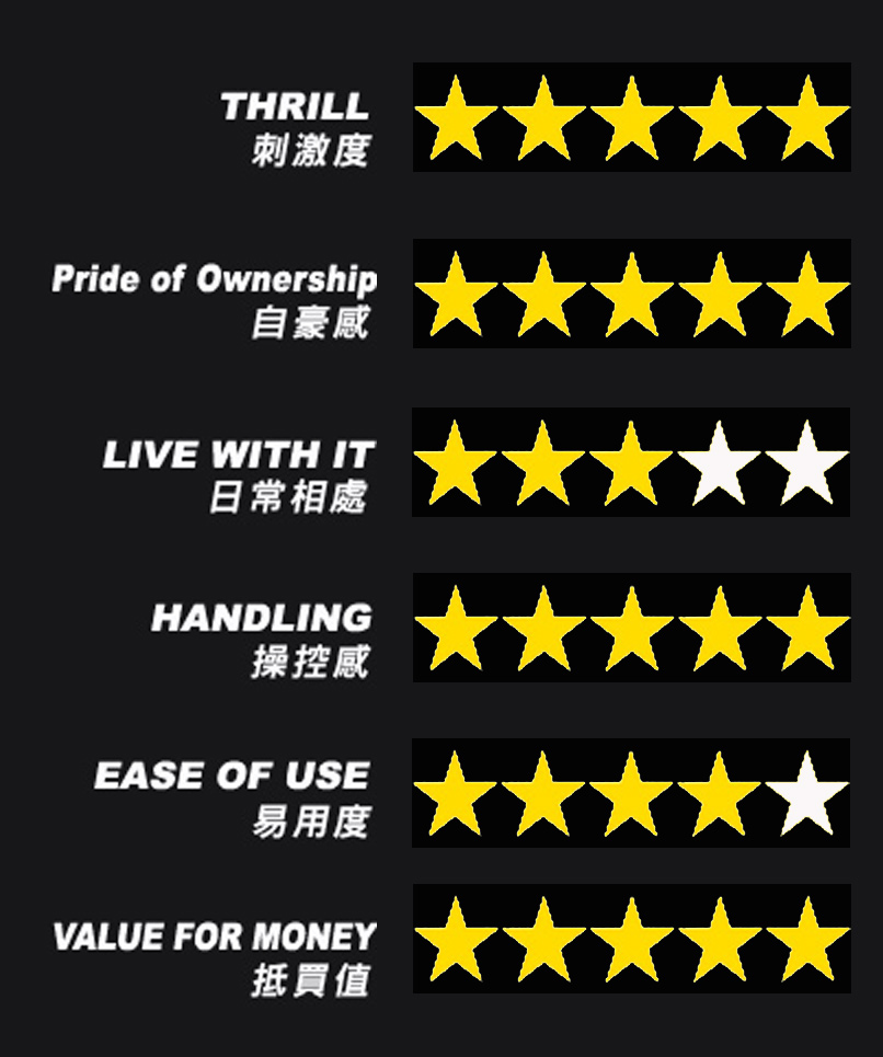 | V4S的馬力和加速感,可以用狂野來形容。以我擁有過和嘗試過的跑車,除了H2R之外,V4S的加速表現應該是最快。即使是H2,個人感覺也未必可以壓倒V4S。原因應該是V4S車身好輕,馬力又有214hp。在所有現時公升級跑車之中,論加速表現,我相信V4S最強,再讚! |