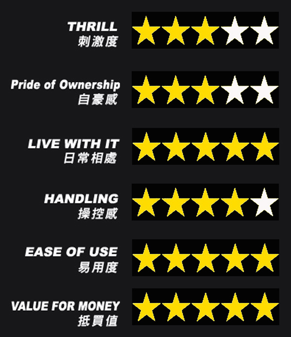 200的尾避震是孖筒設計,Gentleman是中置單筒設計。在實際駕駛時,分別相當明顯。孖筒避震因為沒有連桿作用,令到避震反應很raw很直接。你會很清楚地感覺到路面的凹凸情況。換句話說,Legend的避震特性有點像坐快艇,彈跳情況較多。 相反,Gentleman的中置式單筒尾避震,安定性較強。不單只更舒適,也令車尾更穩定,提升運動性能。難得的是YSS避震反應並不是一味靠硬,而是有一定韌度,令車身表現更伏,大大增強過彎信心。 |