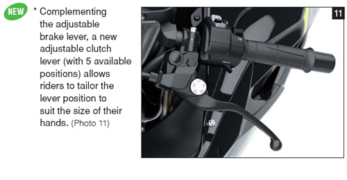 KTRC循跡系統分為三個模式:Mode 1是Race track賽道專用,追求最強大加速力,和ZX-10R的S-KTRC系統相近。Mode 2是Street riding街道乘騎,平衡的追求性能和輪胎打滑的幅度。Mode 3是Mixed / slippery混合式濕滑路況下使用。嚴防輪胎打滑,似是ZX-14R的KTRC系統,在濕滑路段上增加騎士信心和安全感。 |