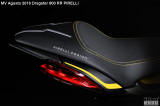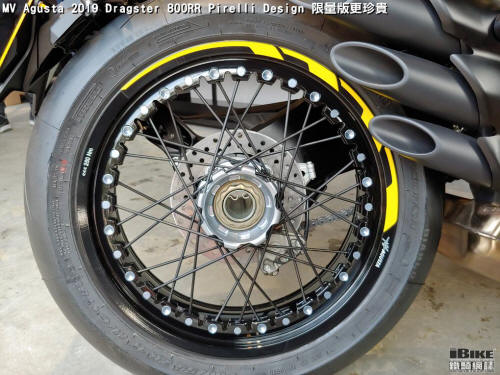這款限量版Dragster 800 RR可配備獨有的DIABLO Supercorsa彩色輪胎,令注目度再上一層。油缸墊和整流罩,是由Pirelli研發部門專門配製的橡膠製成,以確保對這些物品所受的划痕和摩擦具有出色的抵抗力。閃電符號是DIABLO系列輪胎的標誌,新車配備120/70 ZR17前輪和200/55 ZR17後輪的DIABLO Supercorsa SP和6英寸輪圈,令到新車的辨識度都相當高。