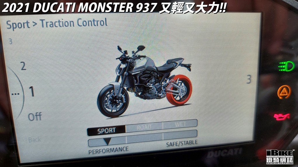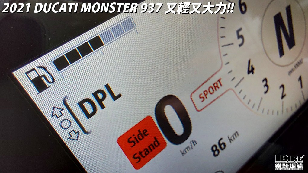 Monster 937有分標準版和Plus版。Plus版只是加上小風擋和單Seat冚。今次試騎是標準版。新車座高只有820mm,換低座和狗骨,甚至可以把座位降低至775mm。如果以成衣來比喻它的話,今代Monster 937便像一件one size的成衣,單一呎碼適合任何人穿著。