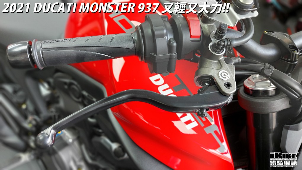 看一看新車的基本數據:111hp馬力和9.5kg-m扭力,放入只有166kg的羽量級車身,威力十足。正因為改用Panigale V4的鋁合金車架,令到高速操控變得更強,所以原廠並沒有為Monster 937設置轉向釘把,這是用行動證明新車的操控相當穩定。
