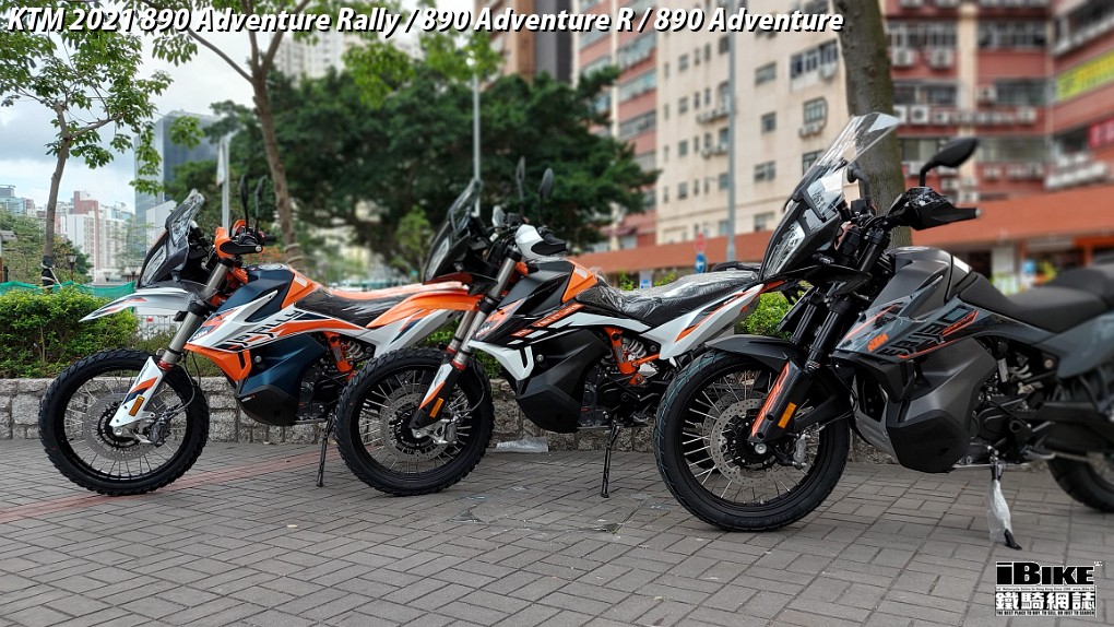 三款890 Adventure的引擎和車架都是一樣,也都配備了TFT彩屏,頭尾輪直徑都是頭21吋尾18吋。以行街為主的890 Adventure,配兩級座墊和高風擋。而Adventure R和Rally版的風擋較低,配上越野輪胎。留意只有Rally版採用有內膽設計,方便在野外進行替換或修補,其餘全都是無內膽設計。
