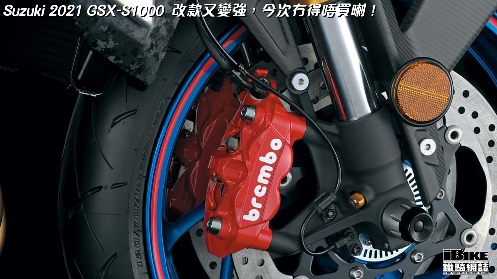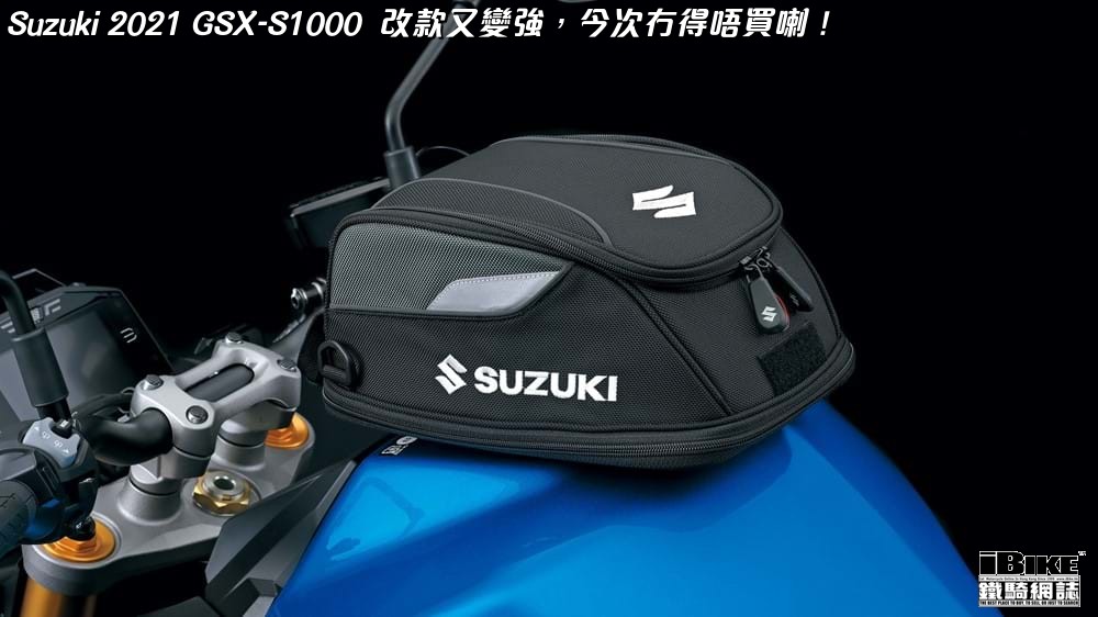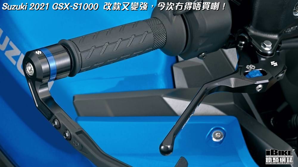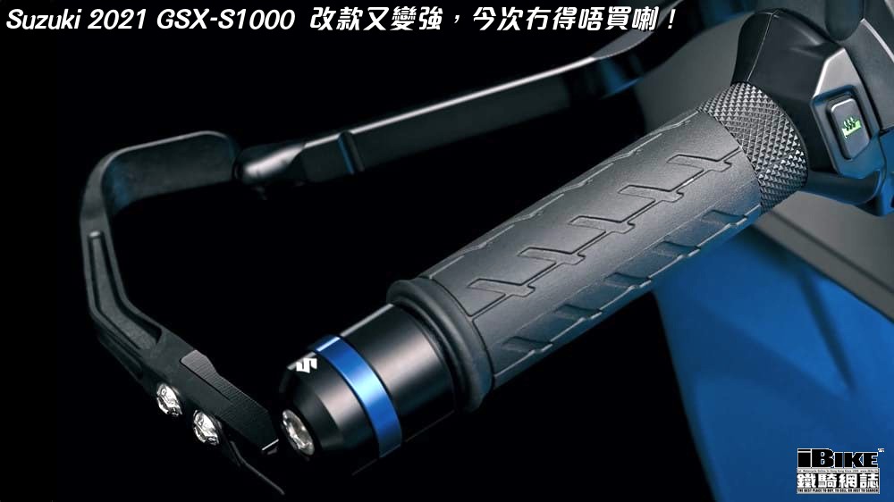 2021年新款GSX-S1000,機器的廢排一方面符合歐5規格,另一方面強化了車身的電子設備和騎士輔助系統。外觀方面,車身兩側先鼓起肌肉,再來一個MotoGP式的擾流側翼。車頭有三段堆疊式的LED頭燈,油缸容量也有所增加,由17升增至19升,令新車變得更靚仔也更實用。