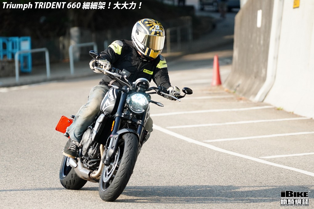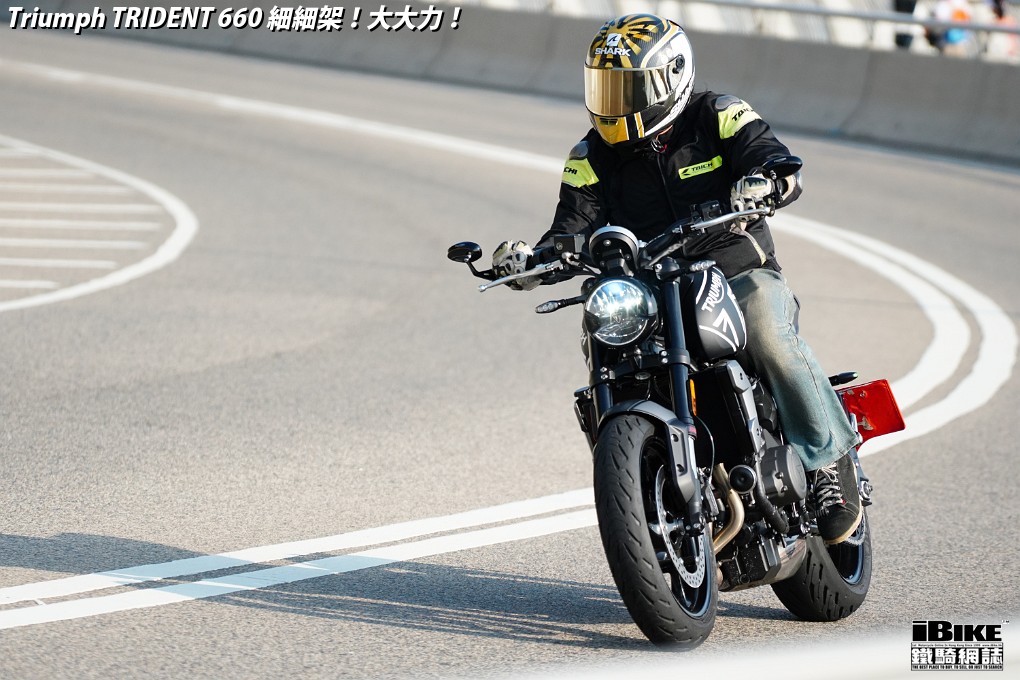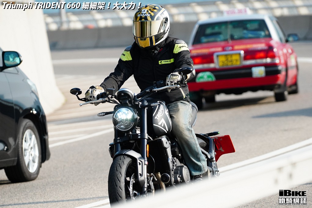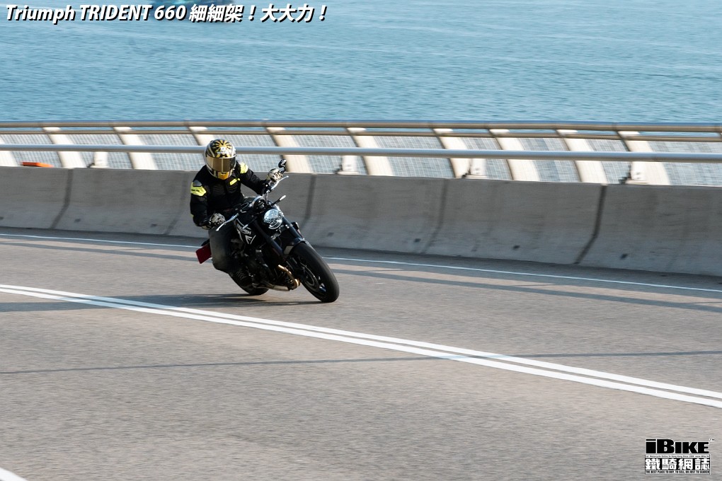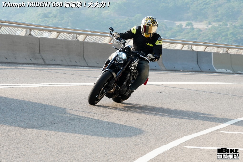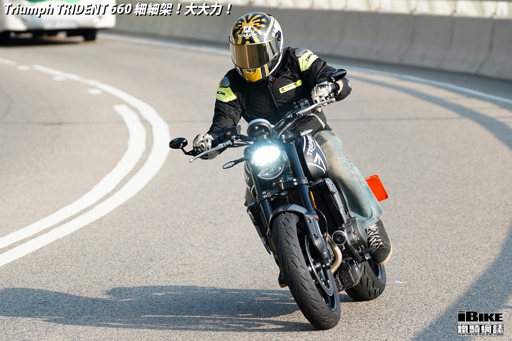講左咁耐,都係想帶出Trident 660著車時那一份即時和平順感。一撻即著,就像直四機器般車身沒有震動感覺。看著仿古LCD圓錶也可以作多種模式顯示,心中高興。相比起同門兄弟Street Triple 675,Trident 660少了一份神經質,明顯較淡定平和,舒適度也更高。在rain mode和road mode之間來回比較,發現rain mode在4000rpm以上時表現較柔和,而road mode則樂意發力再上。