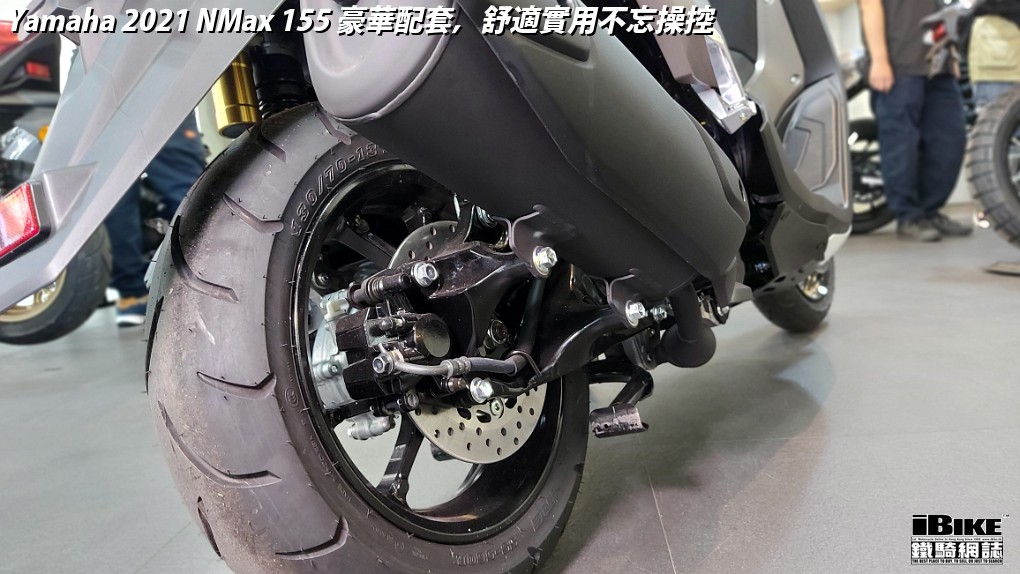 NMAX的制動系統是頭尾230mm碟煞,附ABS功能。為進一步提升安全,Nmax更配備了牽引力控制系統,當系統檢測到有到任何輪胎打滑跡象時,便立即限制後輪的動力,從而使駕駛者在潮濕或鬆散的路面上,可以更放心行駛。
