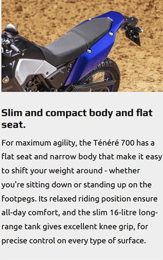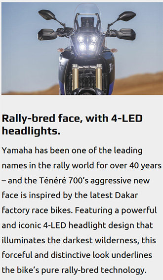 Yamaha Tenere 700早在2016年便以T7概念車身份亮相,以MT-07的689cc直二機器為本,配以一身越野配套,定位能參加達卡拉力賽級數的專業耐力車種。Tenere 700更在2018年展開了世界修練之旅Tenere 700 World Raid,足跡走遍世界各處極端地形,以證明新車的本領。