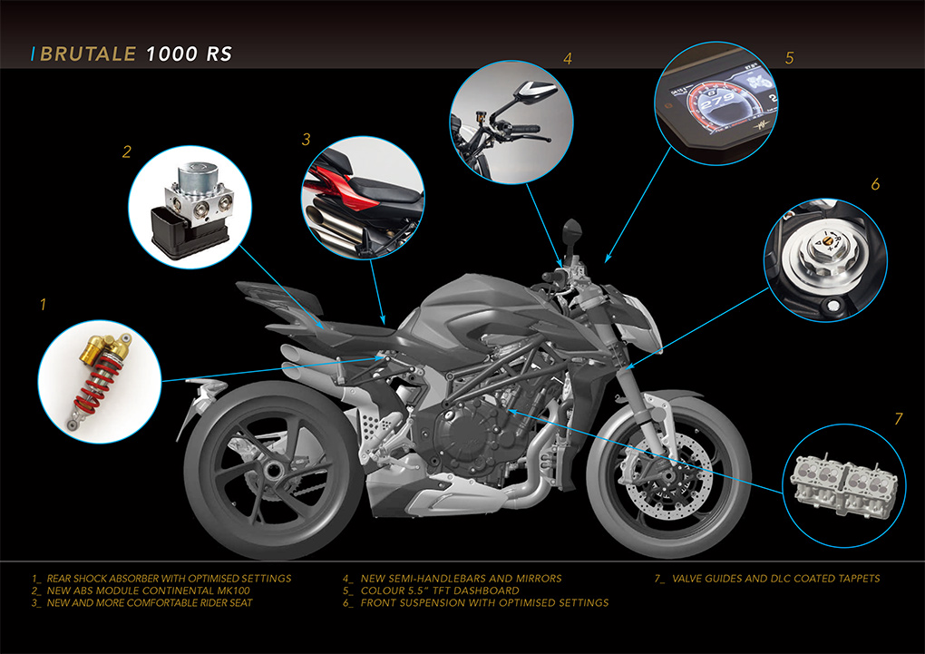 Brutale 1000RS仍然擁有公升級Brutale獨有的霸氣風翼,機器和車架都一樣,在外觀上也沒有太大分別。比較明顯是RS版換走跑車的分離式把手而改用街車把手,頭尾避震筒也由Ohlins電子避震改為前Marzocchi後Sachs全調式機械避震,顏色也由金色轉為黑色。