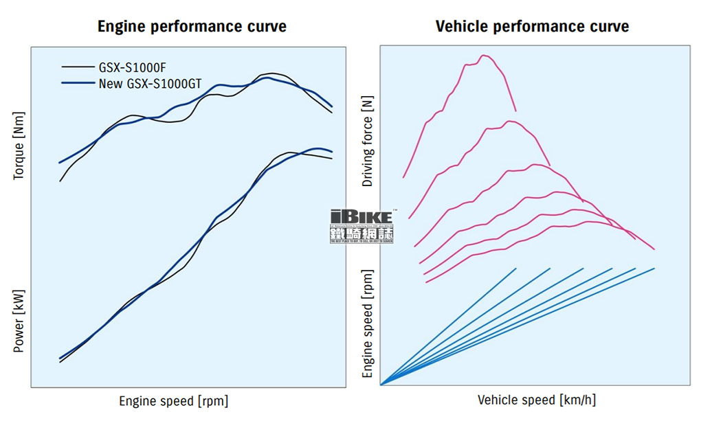 和GSX-S1000F相比,GT在各方面都有更大進步,引擎部件經過大幅度改良