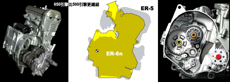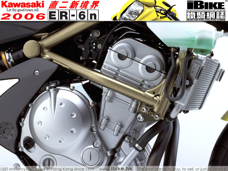 隨著2006年款的Kawasaki ER-6n的出現,我們是時候重新認識直二引擎的好處。Kawasaki不惜工本,運用現今製造跑車引擎的技術,重新煉製的這臺直二引擎。Kawasaki擁有豐富的直二引擎製造經驗,EL,EN和ER車系都是令人放心的直二車種,所以ER-6n的新式直二引擎,無論是馬力和扭力,均比Suzuki的中量級V2皇牌車種