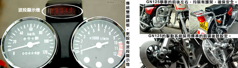 而GN125俾油的動力反應一般,主要是四衝程124cc引擎提供合理的動力, 而前碟後鼓掣動系統, 性能以柔順為主,避免初學者因為掣動系統太過敏感而產生反效果。