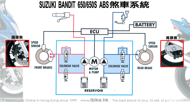 Bandit 650可以選配ABS防鎖死系統,數碼式ABS系統監控著迫力桿角度車輪的轉速,確保輪胎時刻提供最大的抓地力。前輪一對290mm全浮碟和雙活塞卡鉗,碟芯重量有所減輕。後碟的掣動卡鉗重量和體積均有減輕。
