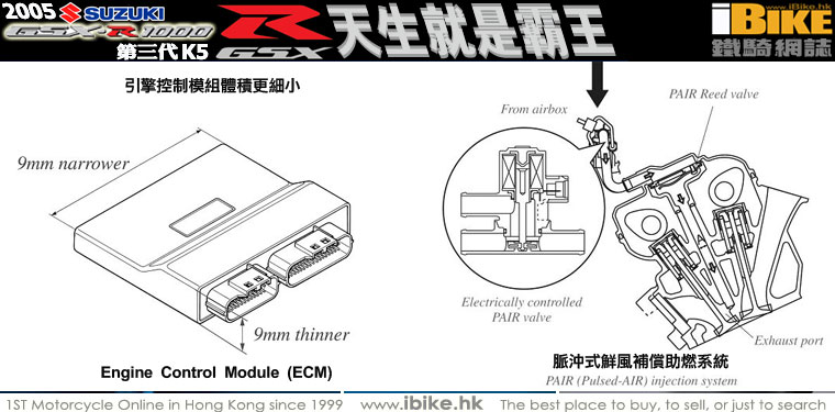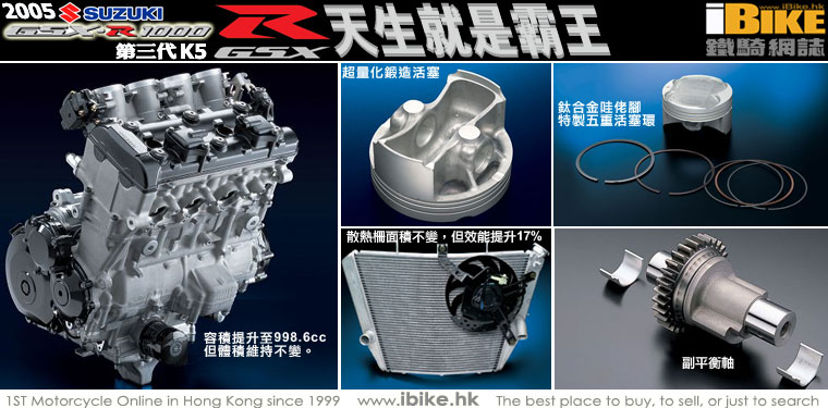 第二項修改是擴大了盤頂的生死氣活瓣,直徑為別為30mm/20mm。第三項改動是哇佬腳採用鈦合金製造代替了以前的鋼鐵,令哇佬腳的總重量減輕了接近100克!引擎轉數因此可獲得額外的1000rpm空間。轉數提升了,咁又點?好戲在後頭:第四項燃燒室的上方空間經過修改,令壓縮比由12.0:1提升至.12.5:1,唔使講都知道K5的引擎會更狂野。所以推桿和曲軸都經過強化來應付新增的工作量。