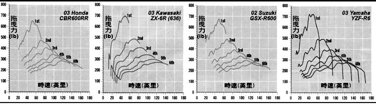 令人相當意外的是鈴木的GSX-R600能以超然姿態遲收車,過彎速度也比其餘三位對手高了一截。可惜一到細彎時馬力不夠新車強而比對手們拋離。