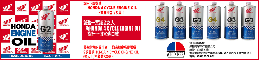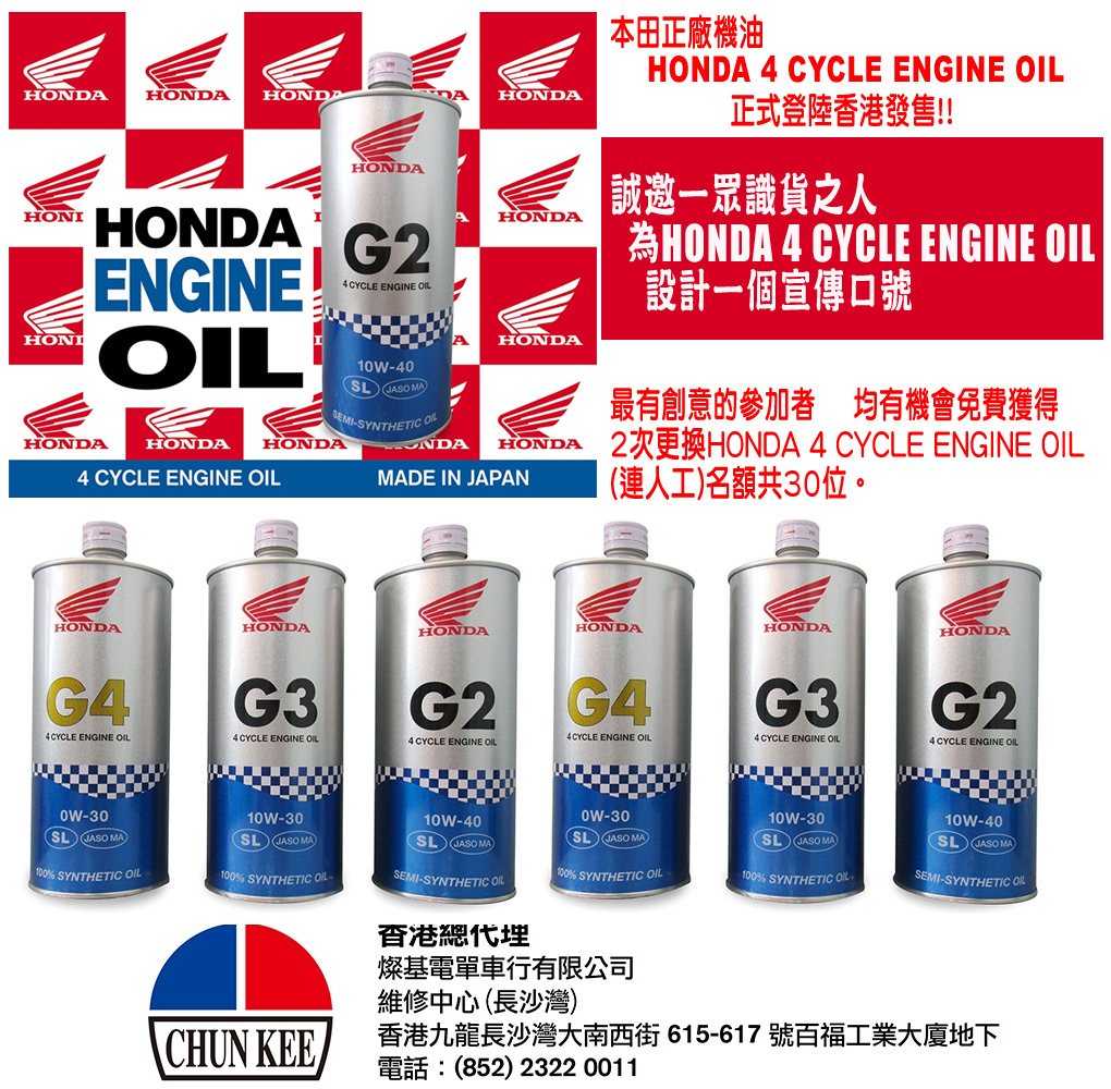 最有創意的參加者均有機會免費獲得 2次更換HONDA 4 CYCLE ENGINE OIL (連人工),名額共30位。