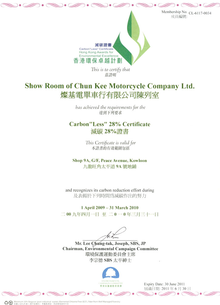 本田電單車總代理燦基電單車行有限公司 獲頒減碳證書