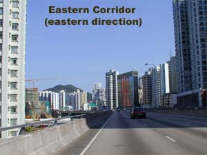 | Exit from the eastern corridor (eastern direction) when you see the "Shaukiwan exit". Keep going down on the exit downward slope, and take the first right turn after you passed the "blue" end-of-highway road sign. | |
