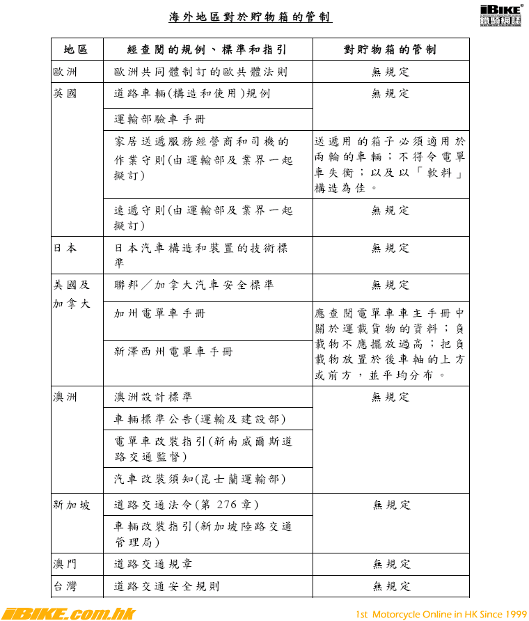 從研究所得,電單車上的貯物箱並無國際規例或標準,而所有上述地區並無就貯物箱作出具體規定。然而,英國和美國曾發出有關貯物箱構造及使用的指引或守則。研究結果的摘要列於附件2。
