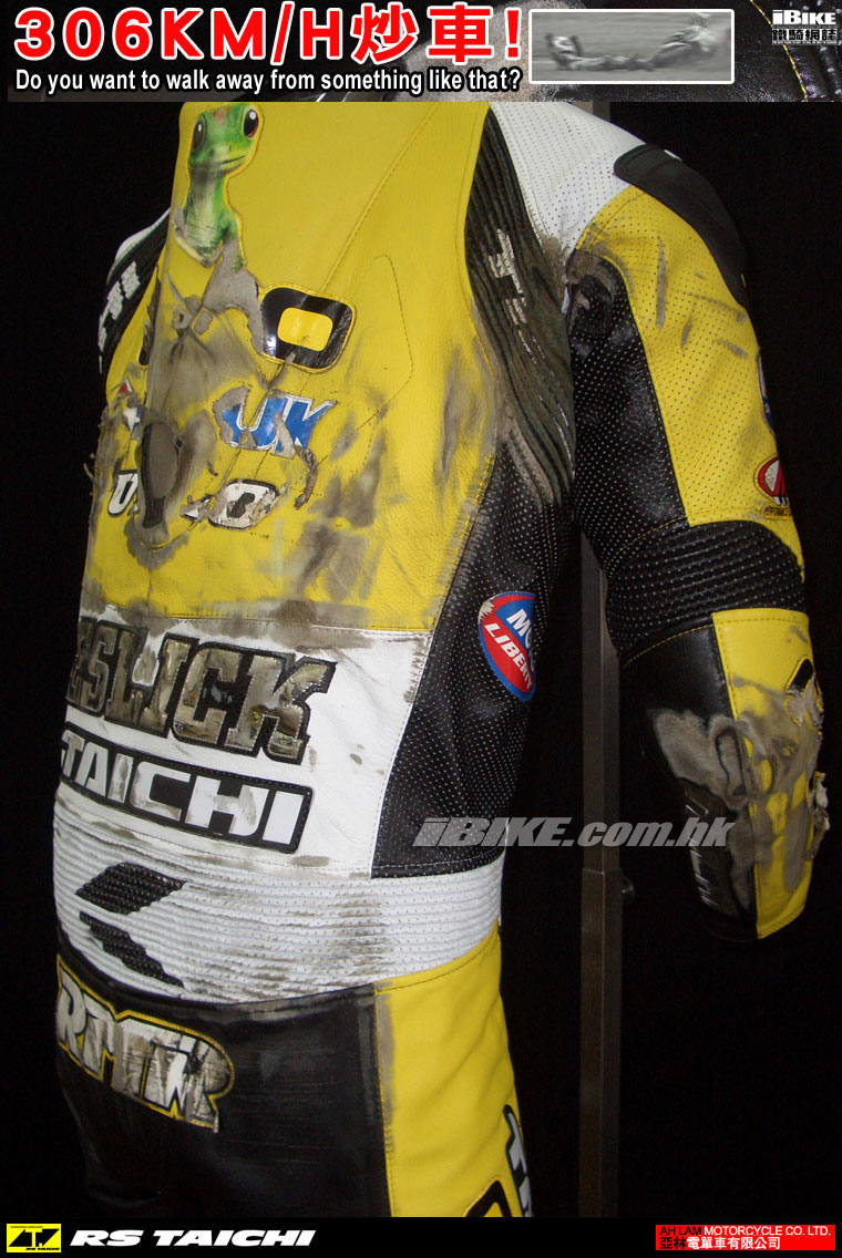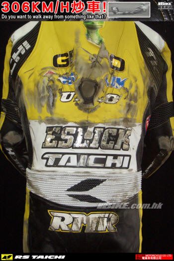 車手於軌道上滑行一段時間後卻可安然無恙自行站起來.其後更可再次投入比賽. 重要是: 當時他是穿著RS TAICHI的賽車皮衣.