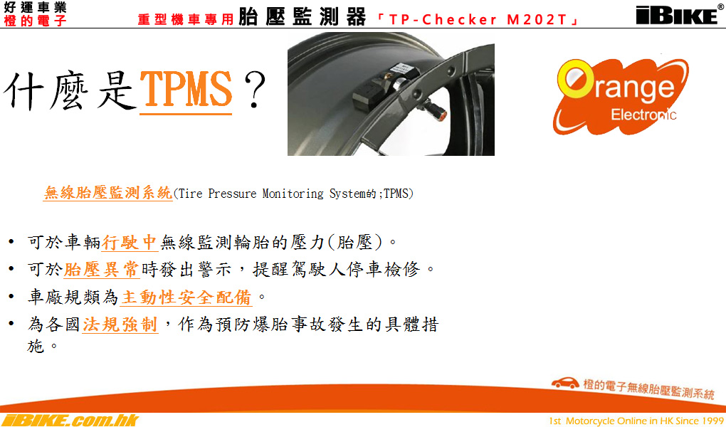 推出的「TP-Checker」胎壓監測系統時,深感只有兩個輪胎的重型機車,更需要這樣的產品來減低騎士因爆胎所造成的生命威脅,讓廣大騎士能安心、盡情的享受駕乘樂趣。