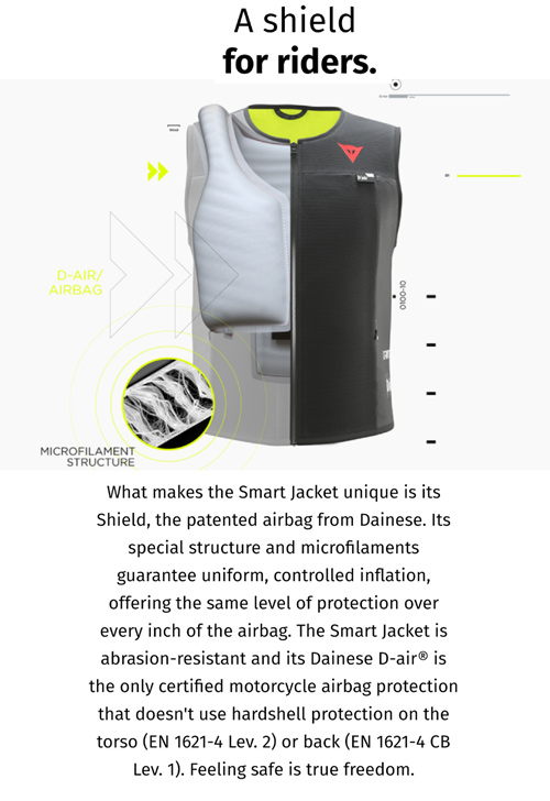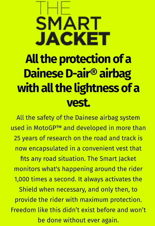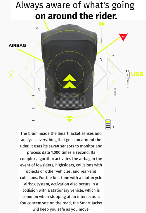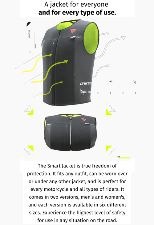 Smart Jacket設計通風透氣,可以摺疊存放,也沒有任何線材和電單車連結。背心的運算模組連接三個加速感應器、三個陀縲儀、一個GPS定位感應器,以每秒一千次的運算速度,探測騎士身體的動態狀況。無論是lowside / highside,或是和其他車輛相撞,甚至在靜止狀態被其他車輛追撞,Smart Jacket都會在之間啟動氣囊,保護騎士。