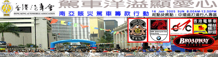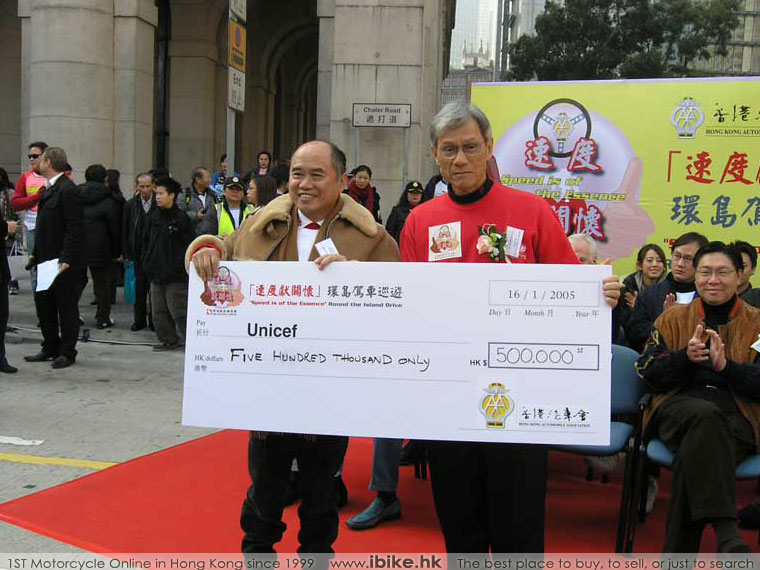 在2005年一月十六日星期日早上,香港有幾百位熱心的駕駛人士齊集在中環遮打道,參加一項名為「速度獻關懷環島駕車巡遊」的環島慈善巡遊。這次巡遊由香港汽車會(HKAA)主辦,為聯合國兒童基金會的亞洲海嘯賑災基金籌款。 |
