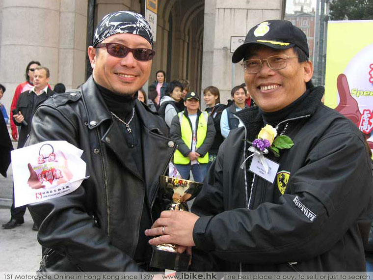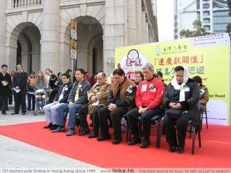 在簡潔的開幕儀式當中,眾人均站立和座位上默哀一分鐘以示對受難者的哀痛。當數位主禮嘉賓完成致詞並接受企業捐贈的善款後,便馬上頒發紀念狀給籌得最高善款的各組參加者。原來是次活動不論汽車或電單車都最少要籌得港幣一千元並直接存入賑災戶口,才能符合資格參加這次巡遊。Harley