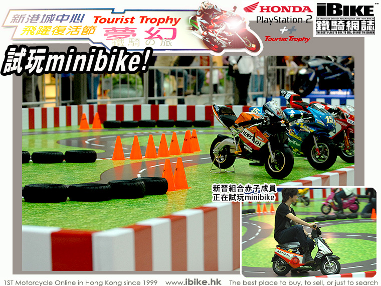 活動主題全部都是和電單車有關,包括Honda新款跑車和象牌高性能輪胎展覽。市民只需在商場中消費符合指定要求,便可以有專業攝影師替你與Honda電單車合照留念、試玩PS2 TT、minibike和遙控電單車等優惠。