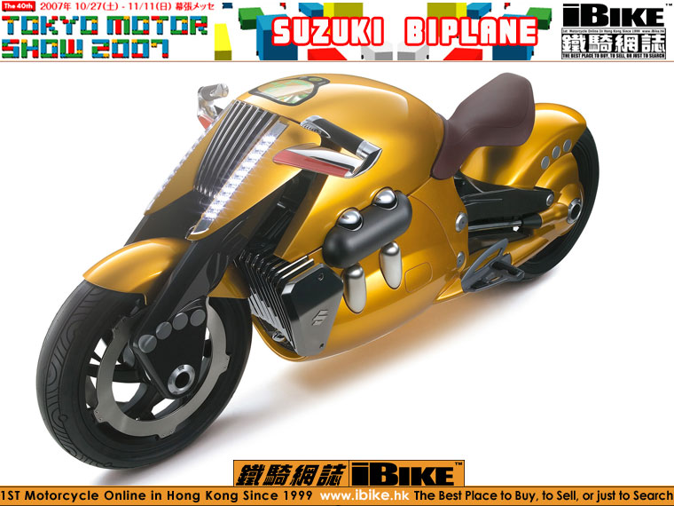 老編認為Suzuki Biplane是一臺嚇外行人多於取悅內行人的概念電單車。Biplance的外型設計意念,竟然是來自駕駛飛機。Suzuki對Biplane並沒有太多機械性描述,只知道是由一臺1000cc四衝水冷V4 DOHC引擎推動,車身長闊高分別是2166mm x 645mm x 906mm。波箱則是CVT自動變速波箱。